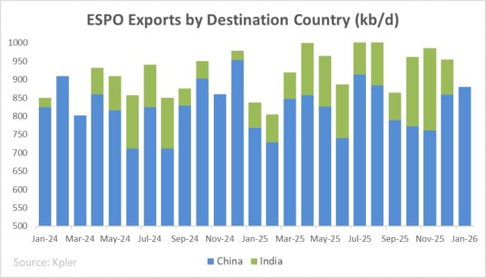 برای نخستین بار از نوامبر ۲۰۲۴، صد درصد صادرات نفتایاسپیاو روسیه راهی چین شد. حتی با کنار گذاشتن عرضههای خط لولهای در حدود ۸۲۰ هزار بشکه در روز، محمولههای دریابرد روسیه به تنهایی ۴۶ درصد بیشتر از صادرات عربستان سعودی بود؛ در حالی که ریاض با وجود جایگاه دیرینهاش بهعنوان تأمینکننده اصلی دریابرد پکن، در ژانویه تنها ۱.۲ میلیون بشکه در روز ارسال کرد.